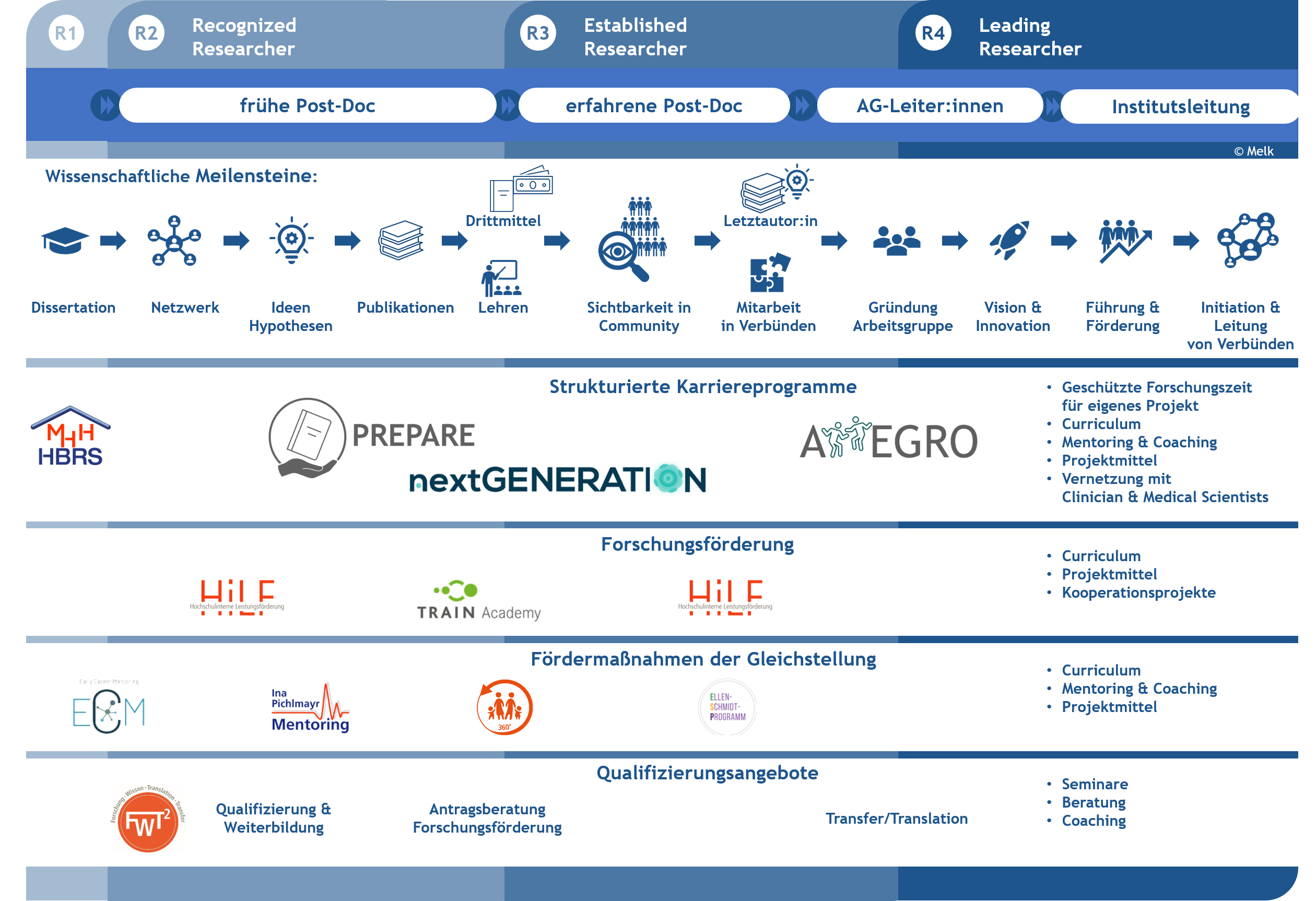 Alle Programme geben Raum für Ihre individuelle Karriereentwicklung mit verbindlichen Zielvereinbarungen und geschützten Forschungszeiten. Das Begleitcurriculum mit Angeboten zur fachlichen und persönlichen Weiterentwicklung wird durch individuelle Karriereberatungen (Mentoring und Coaching) ergänzt.