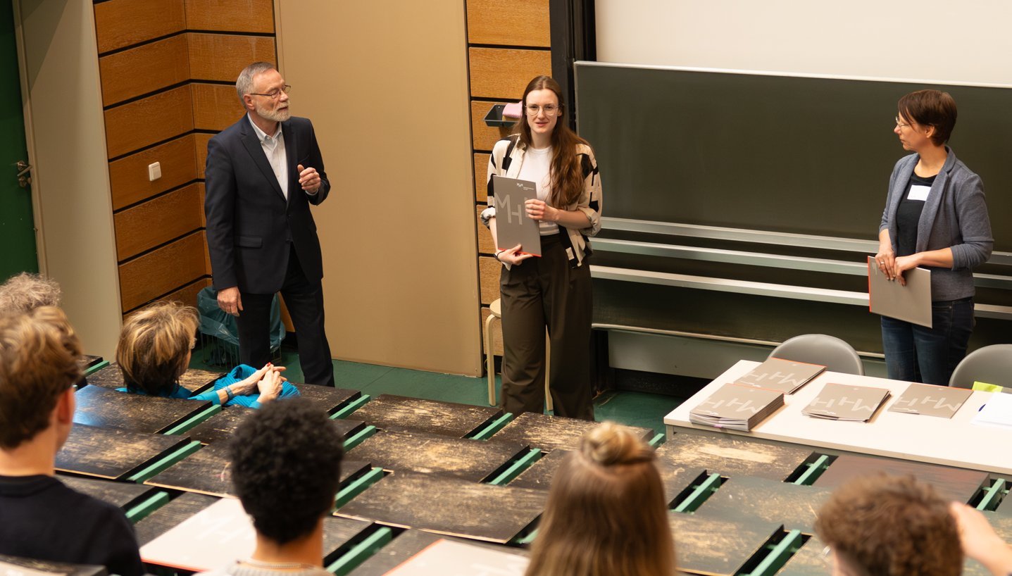 Professor Dr. Rainer Blasczyk erzählte in seiner Ansprache, warum er sich seit vielen Jahren für das Deutschlandstipendium engagiert. "In meiner Studienzeit war ich chronisch pleite", so der Transfusionsmediziner. "Und ich kann mich gut daran erinnern, dass das beim Studieren wirklich hinderlich war. Allein deshalb halte ich diese Form der Nachwuchsförderung für wichtig." Als die Studierenden ihre Stipendienurkunden entgegennahmen und sich kurz vorstellten, wurde auch die Bandbreite des Stipendienprogramms deutlich. Nicht nur Studierende der Humanmedizin profitieren von dem Programm, auch die Zahnmedizin und kleinere Studiengänge wie Public Health und die Biomedizinische Datenwissenschaft waren vertreten. "Die Verteilung erfolgt nach dem Proporz der Studienplätze. Aber ich kann sagen, dass wir in allen Bereichen herausragende Studierende kennenlernen", erklärte Studiendekan Just.