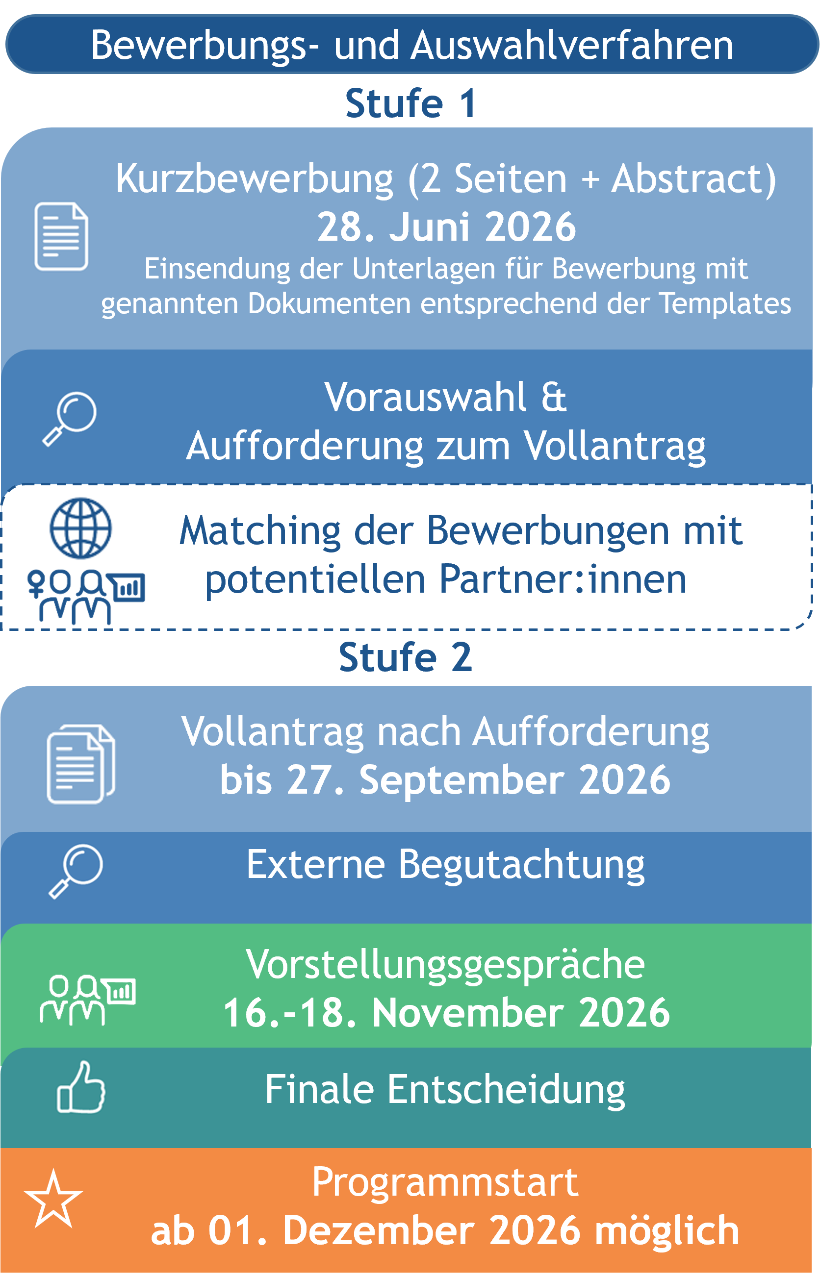 The selection is based on a two-stage process and takes into account individual scientific and clinical achievements, particularly in the context of the desired profile. Please only use the templates provided to enable an assessment in accordance with CoARA.