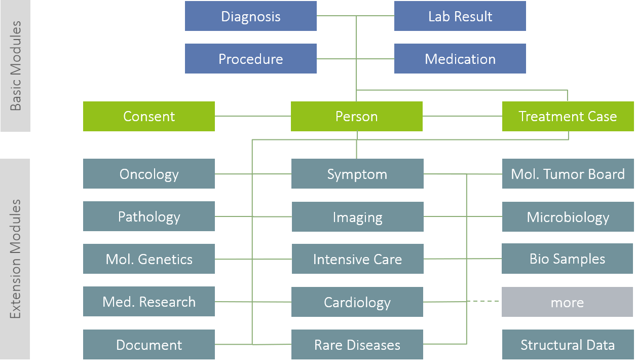 Among other things, our MeDIC provides data according to the specifications and regulations of the MII. All university hospitals connected to the MII infrastructure have agreed on a common core data set (CDS). The CDS consists of basic and extension modules. The seven basic modules (Person, Treatment Case, Consent, Diagnosis, Medication, Procedures and Lab Results) define the interdisciplinary information models. The extension modules, such as "Oncology" or "Pathology Result", represent data from specific application or specialist areas (see Figure 1).