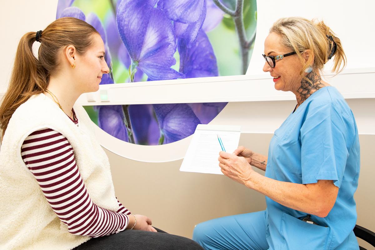 Consultation in the new premises on complementary care measures. Palliative care specialist and pain nurse Tatjana Zielke talking to a patient. Copyright: Karin Kaiser/MHH