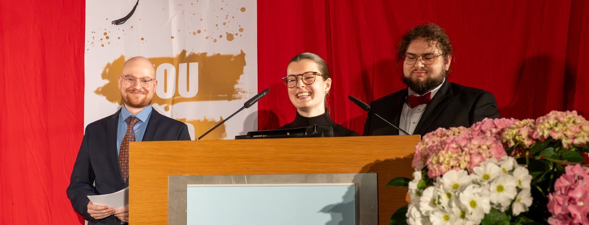 Für die Absolventenrede hatten sich Valentin Gerst, Hannah Paulmann und Jan Tauwaldt zusammengetan. Sie präsentierten in einem „Systematic Review of Academic Life Support” die Höhen und Tiefen ihres gemeinsamen Studiums, nahmen das Mensa-Essen aufs Korn und erinnerten sich an die Momente vor bestimmten Testaten, in denen sie sich gefühlt hatten wie die Tribute von Panem vor den gefürchteten Hungerspielen. Dass sie mit diesen und anderen Gefühlen nicht allein gewesen waren, bestätigten das wissende Gelächter und der tobende Applaus aus dem Publikum.