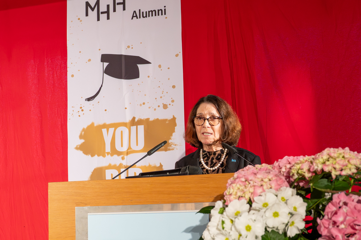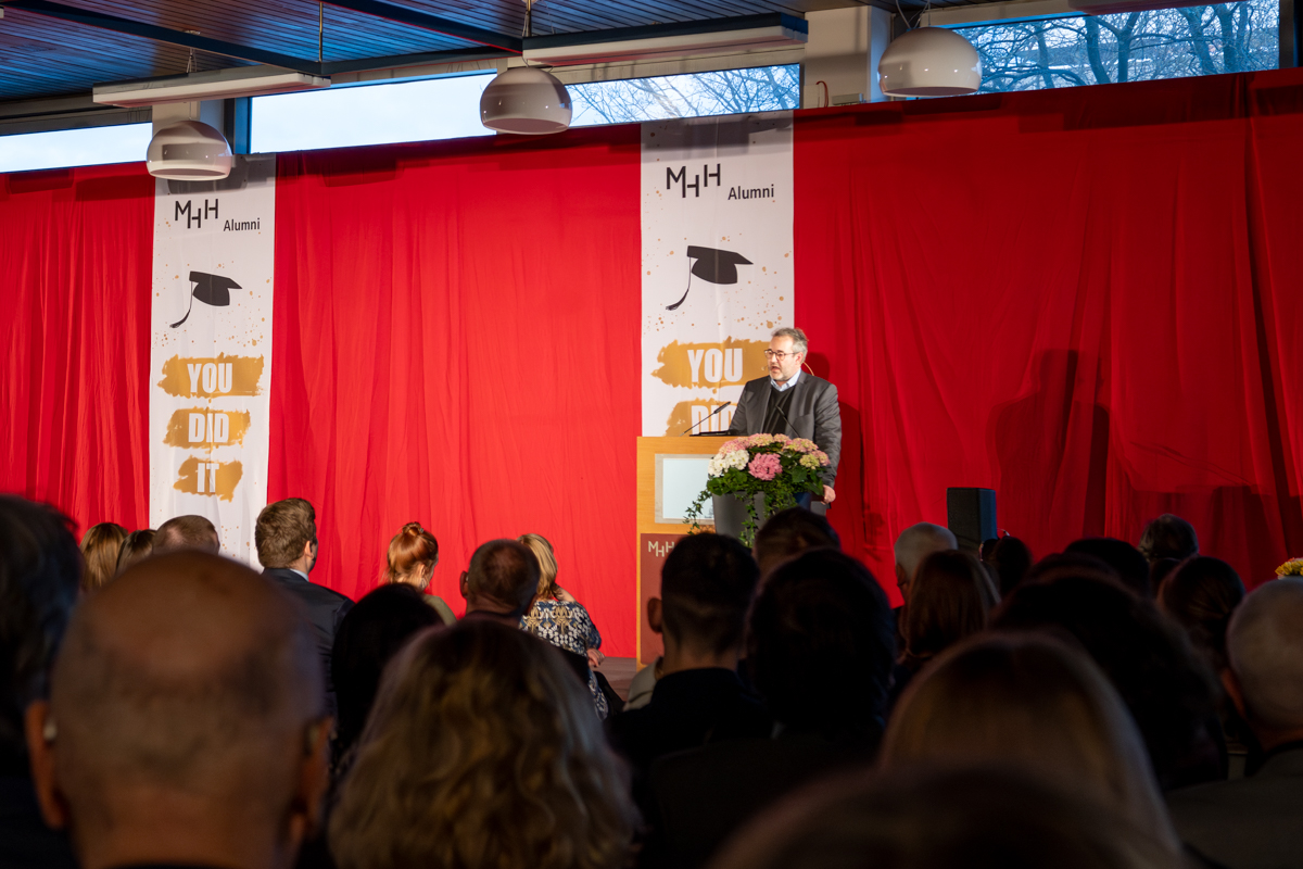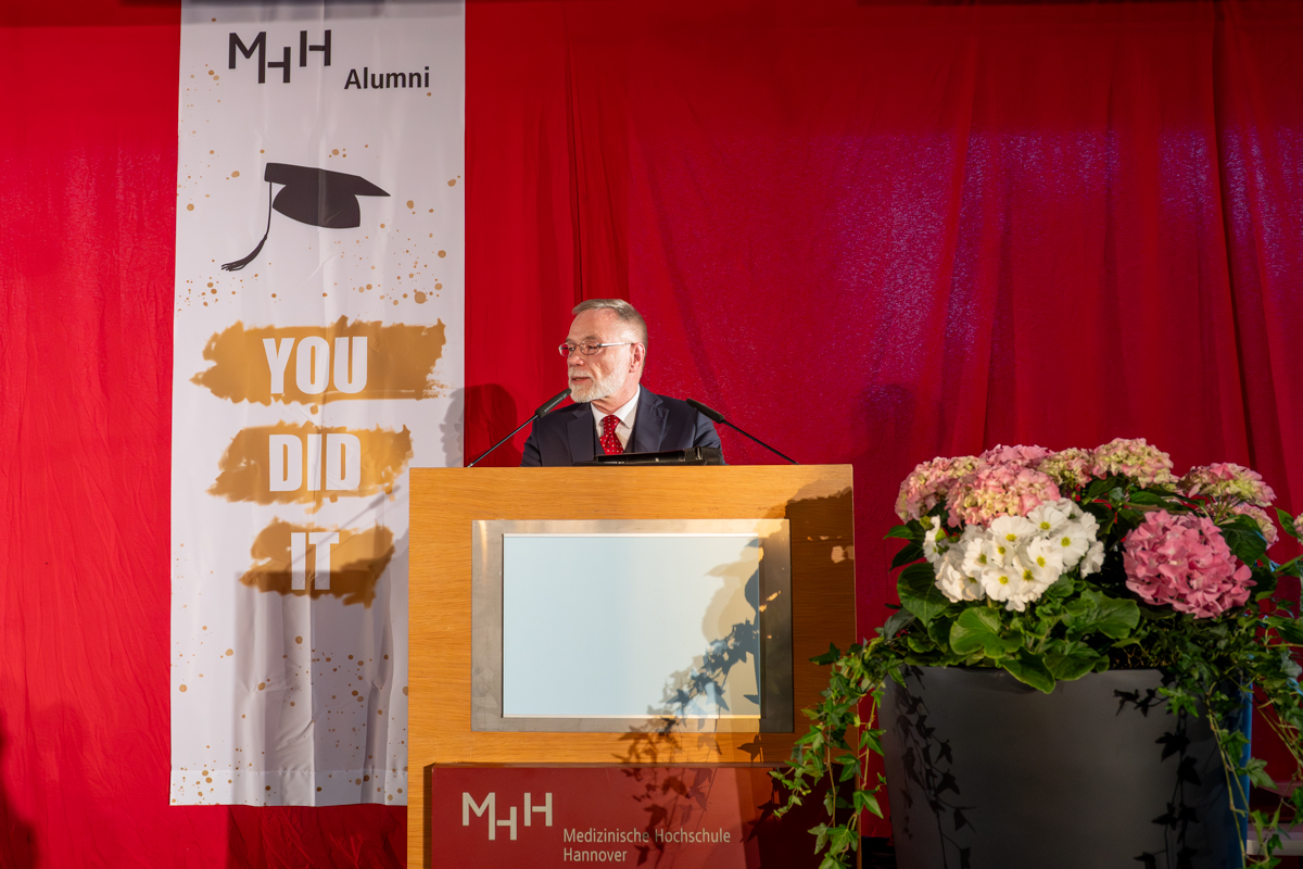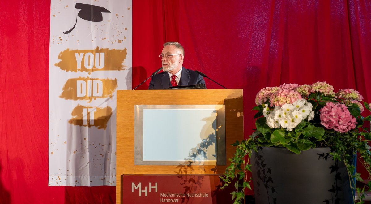 Letztlich war die Befürchtung unbegründet. Über 650 Gäste fanden in der Mensa der MHH zusammen: Absolventinnen und Absolventen, ihre Freunde und Familien hatten alles möglich gemacht, um diesen besonderen Moment gemeinsam zu erleben und Abschied von der MHH zu feiern. Absolventin Lorna Espiga Santos eröffnete die Veranstaltung mit dem Michael-Jackson-Song „Man in the Mirror“, der mit Textzeilen wie „I'm gonna make a change“ sehr gut zum Start in einen neuen Lebensabschnitt passte. Zunächst gratulierten der Alumnivorsitzende Prof. Dr. Ingo Just, die stellvertretende Präsidentin der Ärztekammer Niedersachsen, Dr. Marion Charlotte Renneberg, und Studiendekan Prof. Dr. Christian Mühlfeld den frisch ernannten Kolleginnen und Kollegen in ihren Grußworten. Dabei wurden auch jene gewürdigt, die sie eng durch das Studium begleitet hatten: Eltern und Geschwister, die sich die Sorgen vor der nächsten großen Klausur anhörten, Mitbewohner, die in der Lernphase den Abwasch übernahmen, und nicht zuletzt die Menschen an der MHH, die ihnen über Jahre das nötige Wissen vermittelten. Passend dazu folgte die Vergabe der Lehrpreise, die die MHH jährlich an die besten Dozierenden verleiht.