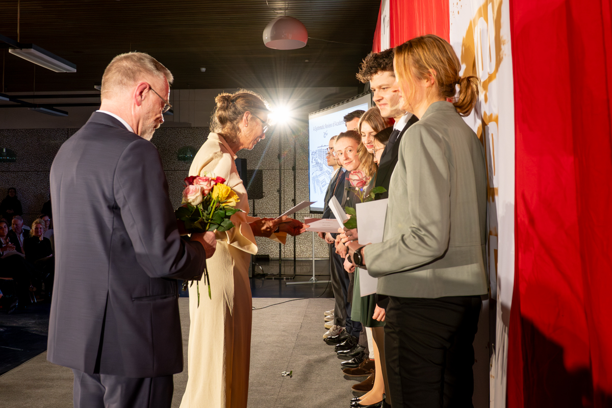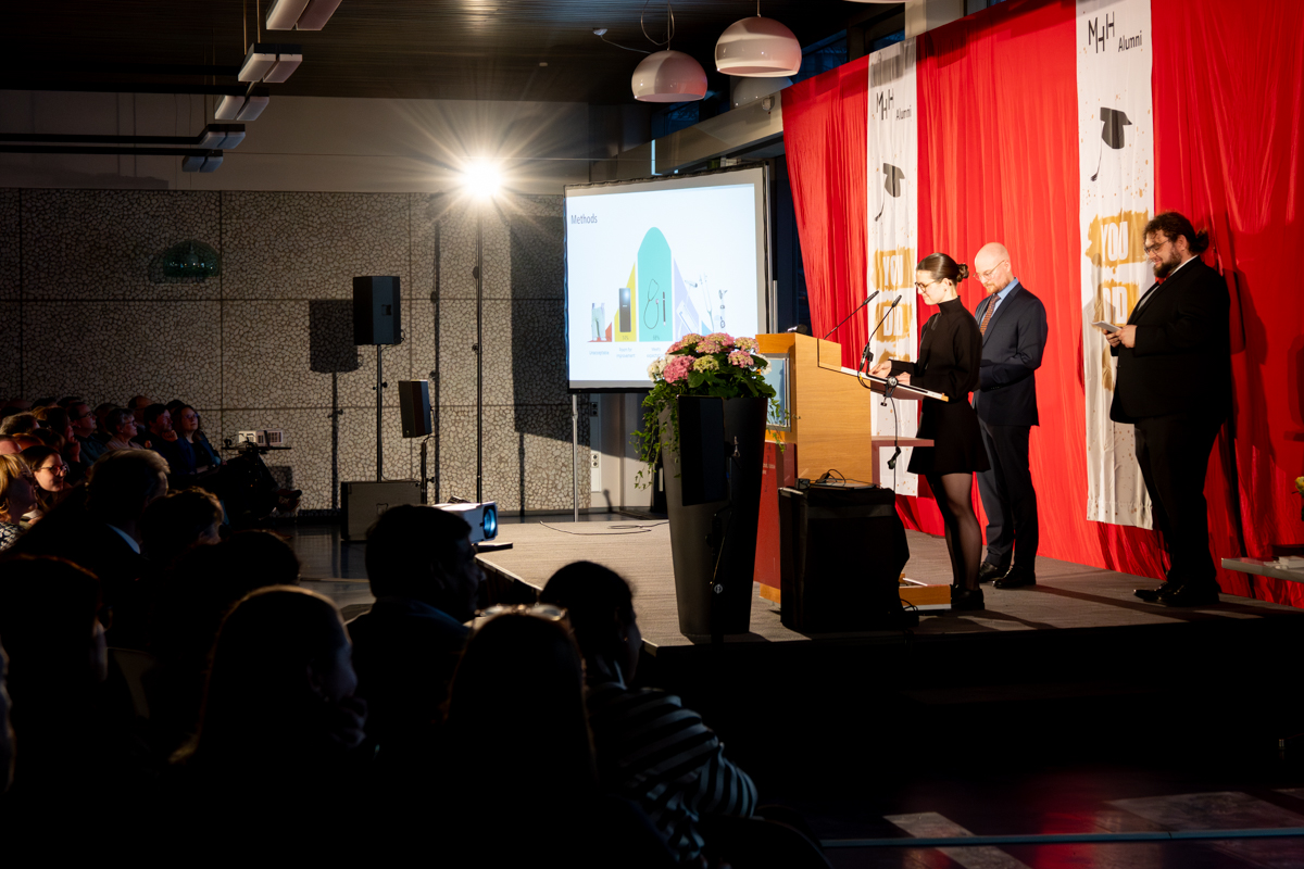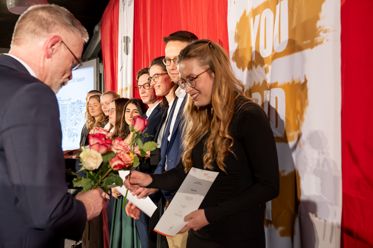 Letztlich war die Befürchtung unbegründet. Über 650 Gäste fanden in der Mensa der MHH zusammen: Absolventinnen und Absolventen, ihre Freunde und Familien hatten alles möglich gemacht, um diesen besonderen Moment gemeinsam zu erleben und Abschied von der MHH zu feiern. Absolventin Lorna Espiga Santos eröffnete die Veranstaltung mit dem Michael-Jackson-Song „Man in the Mirror“, der mit Textzeilen wie „I'm gonna make a change“ sehr gut zum Start in einen neuen Lebensabschnitt passte. Zunächst gratulierten der Alumnivorsitzende Prof. Dr. Ingo Just, die stellvertretende Präsidentin der Ärztekammer Niedersachsen, Dr. Marion Charlotte Renneberg, und Studiendekan Prof. Dr. Christian Mühlfeld den frisch ernannten Kolleginnen und Kollegen in ihren Grußworten. Dabei wurden auch jene gewürdigt, die sie eng durch das Studium begleitet hatten: Eltern und Geschwister, die sich die Sorgen vor der nächsten großen Klausur anhörten, Mitbewohner, die in der Lernphase den Abwasch übernahmen, und nicht zuletzt die Menschen an der MHH, die ihnen über Jahre das nötige Wissen vermittelten. Passend dazu folgte die Vergabe der Lehrpreise, die die MHH jährlich an die besten Dozierenden verleiht.
