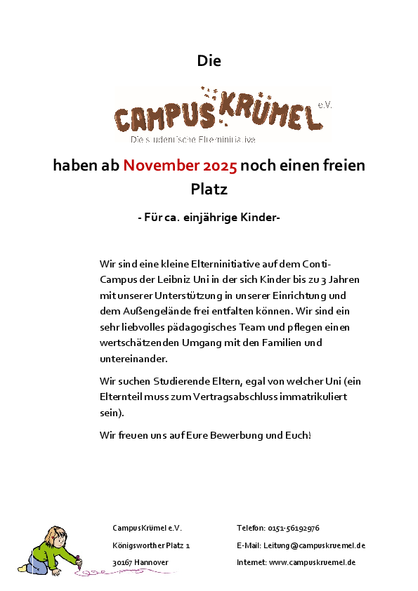 Unten auf der Seite "Studieren mit Kind" des Studentenwerkes finden Sie Informationen auch zu Elterninitiativen in Hannover.