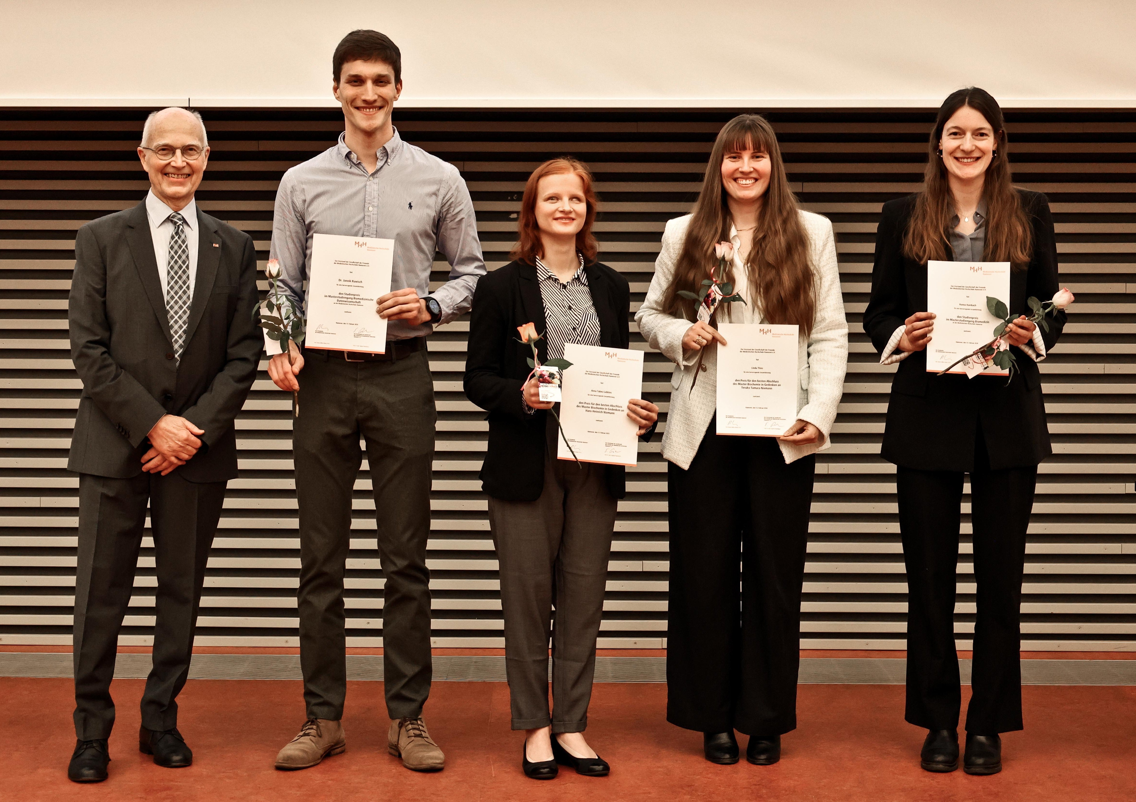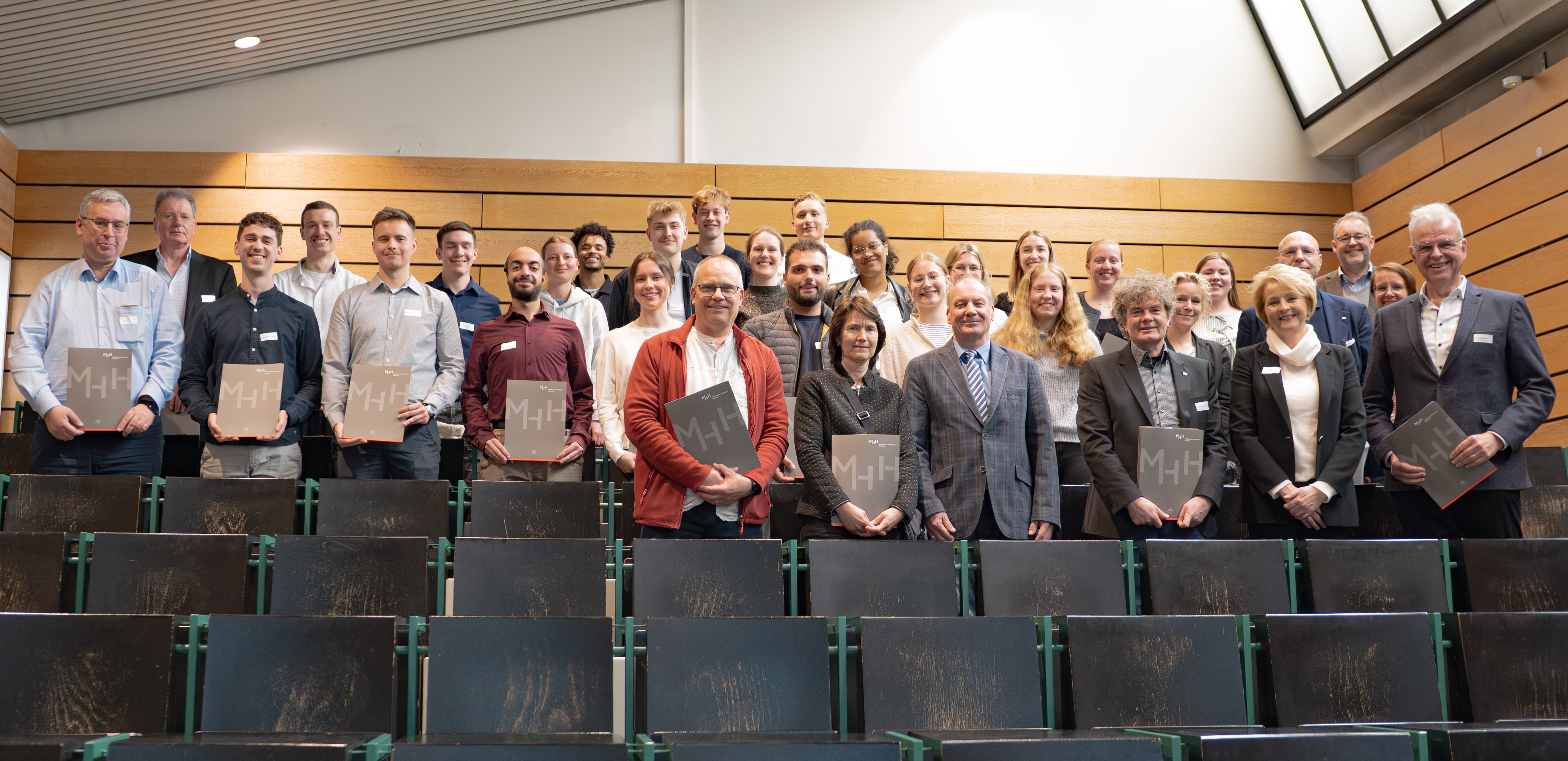 Am vergangenen Donnerstag feierten 43 Absolventinnen und Absolventen der Masterstudiengänge Biochemie, Biomedizin und Biomedizinische Datenwissenschaft mit Familie und Freunden ihren bestandenen Abschluss in Hörsaal F. Die Veranstaltung mit rund 200 Gästen, stimmungsvoller Musik und feierlichen Reden war gleichzeitig gelungener Rahmen für die Auszeichnung der besten Abschlüsse durch die Gesellschaft der Freunde der MHH. Jan-Phillipp Gerhards und PD Dr. Stephan Traidl durften sich als beste Absolventen der Biomedizin bzw. der Biomedizinischen Datenwissenschaft über jeweils 300 Euro freuen. Vanessa Vollmer und Jule Hupfeld teilten sich mit gleichrangigen Leistungen den Teruko-Tamura-Niemann-Gedächtnispreis. Den Hans-Heinrich Niemann-Gedächtnispreis erhielt Niklas Viohl, der an der Urkundenverleihung leider nicht teilnehmen konnte. Die beiden letztgenannten Preise werden für den besten Abschluss in der Biochemie im Sommer- bzw. Wintersemester verliehen und sind mit jeweils 1.000 Euro dotiert. Die Urkunden übergaben der GdF-Vorstandsvorsitzende Professor Siegfried Piepenbrock und sein Stellvertreter Dr. Eckhard Schenke.