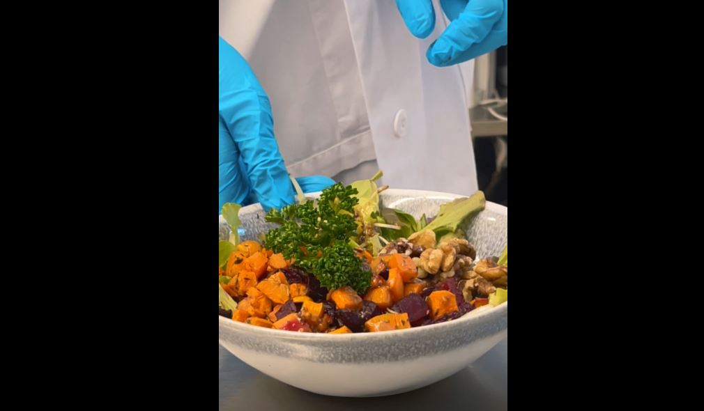 - Rote Bete-Süßkartoffel-Salat auf Teller verteilen, Hirtenkäse darüber krümeln, mit gebackenen Walnüssen bestreuen und genießen!