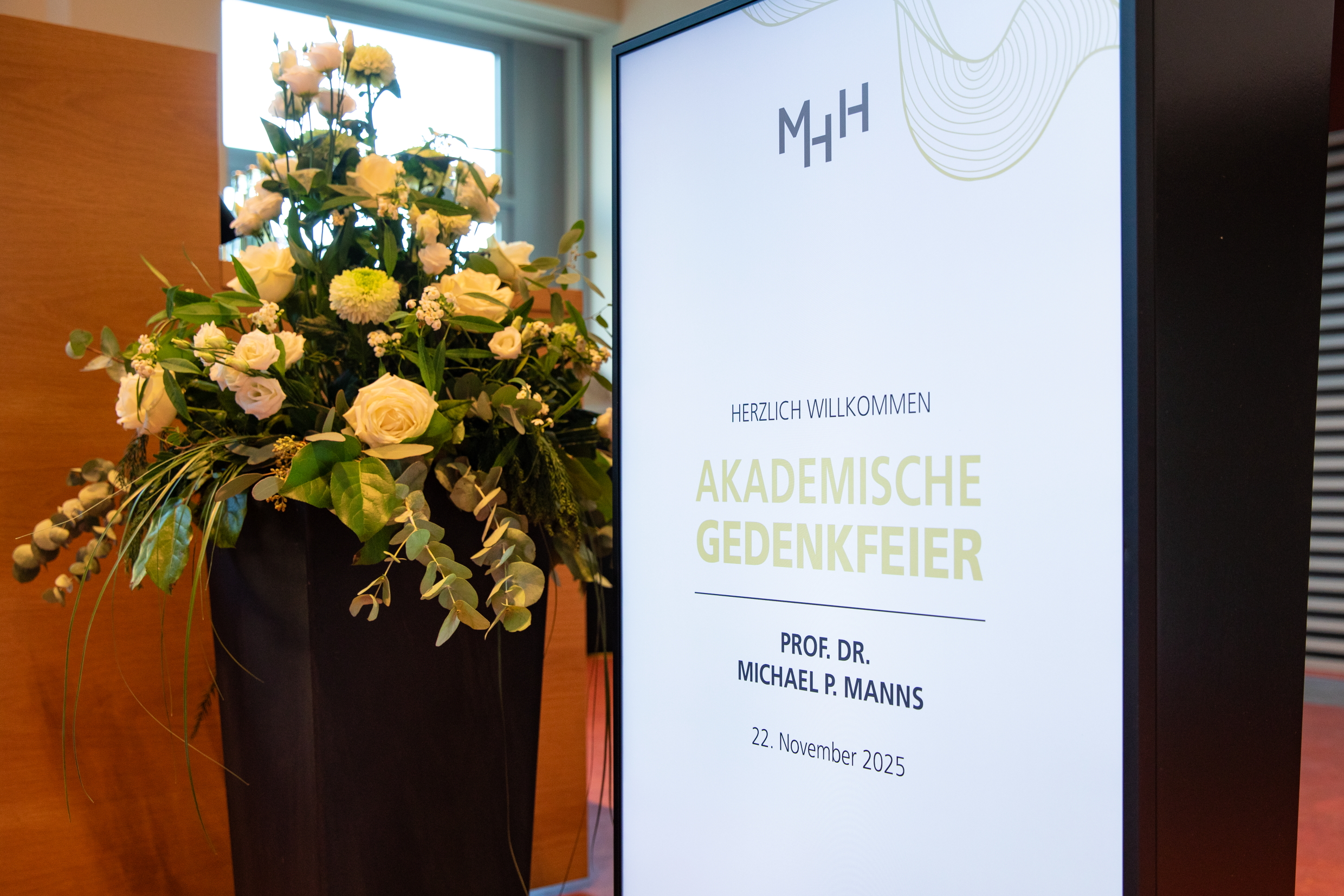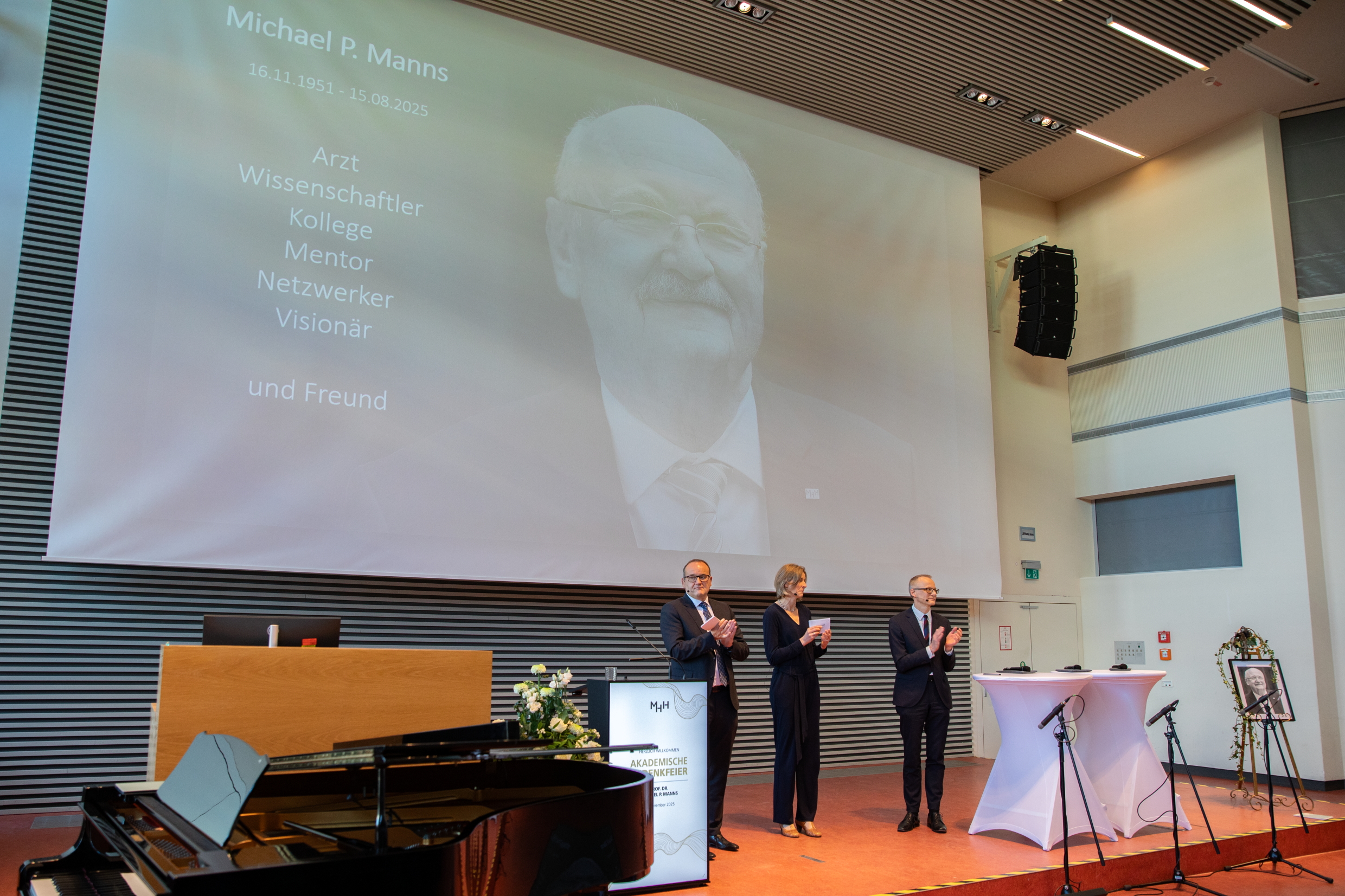 Am Samstag, den 22. November 2025, fand im Hörsaal F der Medizinischen Hochschule Hannover eine akademische Gedenkfeier für unseren ehemaligen Klinikdirektor, Prof. Dr. Michael Peter Manns, statt. Zahlreiche Wegbegleiterinnen und Wegbegleiter aus nahezu fünf Jahrzehnten seines beruflichen Wirkens nahmen an der Veranstaltung teil. Die Feierstunde wurde von Dr. Jennifer Debarry (CiiM), Prof. Dr. Markus Cornberg und Prof. Dr. Heiner Wedemeyer moderiert.