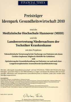 Im Jahr 2010 sind wir gemeinsam mit der Techniker Krankenkasse Preisträger beim Ideenpark Gesundheitswirtschaft der Financial Times geworden. Ausgezeichnet wurden wir für unsere telemedizinische Nachsorge Remote Care für Cochlea-Implantat-Träger.
