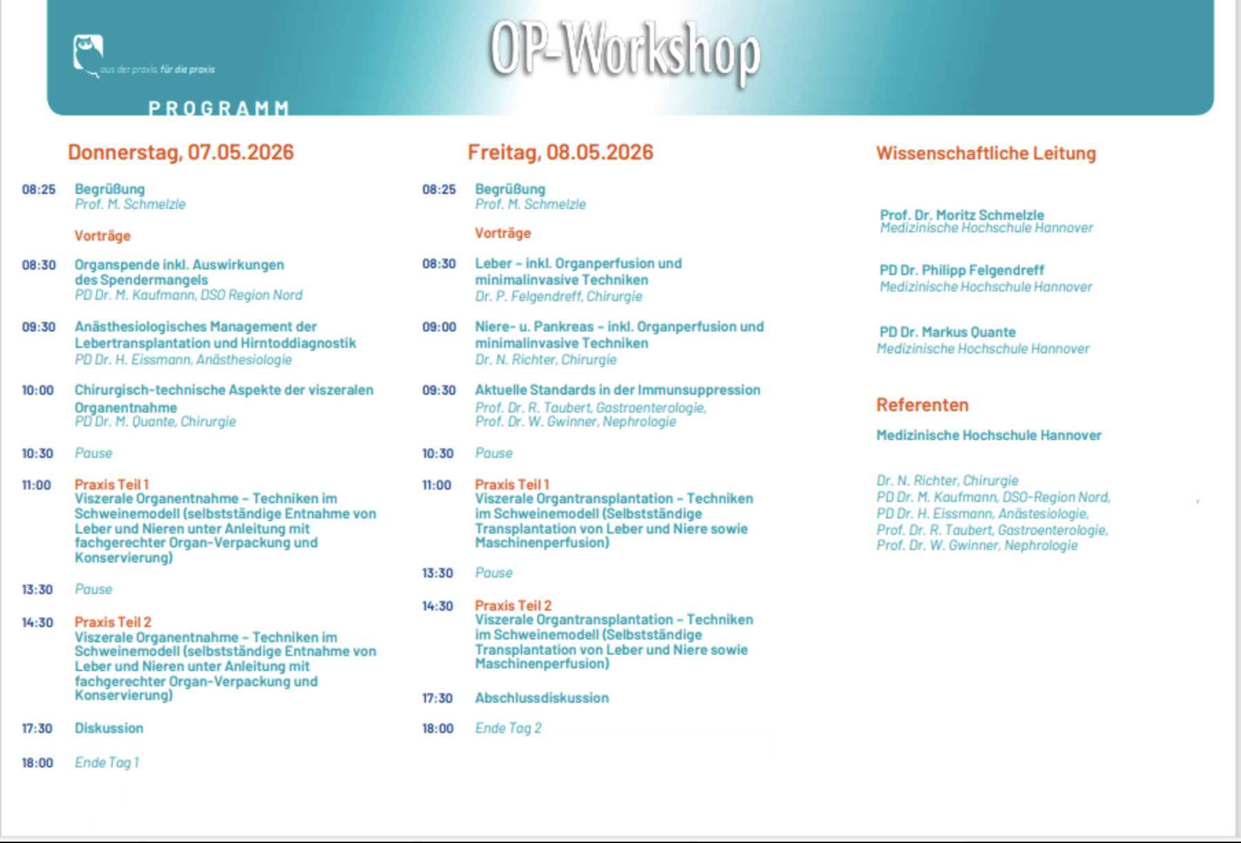 In diesem Kurs sollen die Theorie und Praxis der viszeralen Organentnahme, -konservierung und -transplantation durch Vorträge, Videopräsentationen und vor allem praktische Übungen im Schweine-Modell vermittelt werden. Die praktischen Übungen erfolgen in Kleingruppen von zwei bis drei Teilnehmern und sollen im Zentrum dieser Fortbildung stehen. Zusätzlich werden Grundlagen der Indikationsstellung in der viszeralen Transplantationsmedizin, der Hirntod-Diagnostik, der Organallokation sowie aktuelle Standards der Immunsuppression vermittelt.
