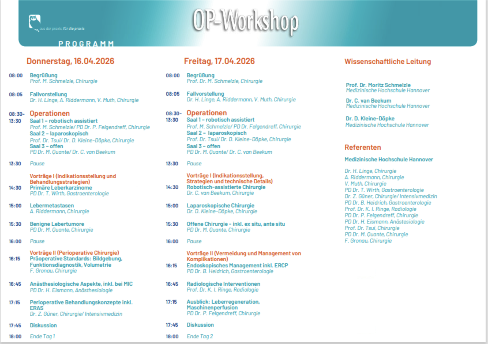In diesem Kurs werden Strategien zur Durchführung von komplexen Leberoperationen vermittelt. Technische Besonderheiten der robotisch-assistierten, laparoskopischen und offenen Leberchirurgie sowie relevante Fallstricke in der täglichen Praxis werden dargestellt und erklärt. Außerdem sollen Kenntnisse für das perioperative Management inklusive Leberfunktionsmessung und die Behandlung von Komplikationen erlernt und die aktuelle onkologische Studienlage auch im Bezug auf neoadjuvante oder adjuvante Therapien vertieft werden.