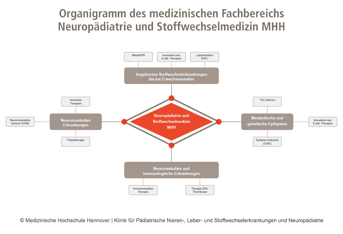 Im Verbund mit der Stoffwechselmedizin arbeiten wir eng mit anderen Fachabteilungen der Hochschule wie zum Beispiel der Neuroradiologie, der Neurophysiologie, der Neurochirurgie und dem Institut für Humangenetik zusammen. Wichtig ist uns die Kooperation mit den wohnortnah betreuenden Kinderärzten. Die Kinder und Jugendlichen werden bei uns möglichst ambulant behandelt. Bei schweren akuten Erkrankungen oder für umfassende Diagnostik kann ein stationärer Aufenthalt erforderlich werden, in dem das Kind multidisziplinär versorgt wird.