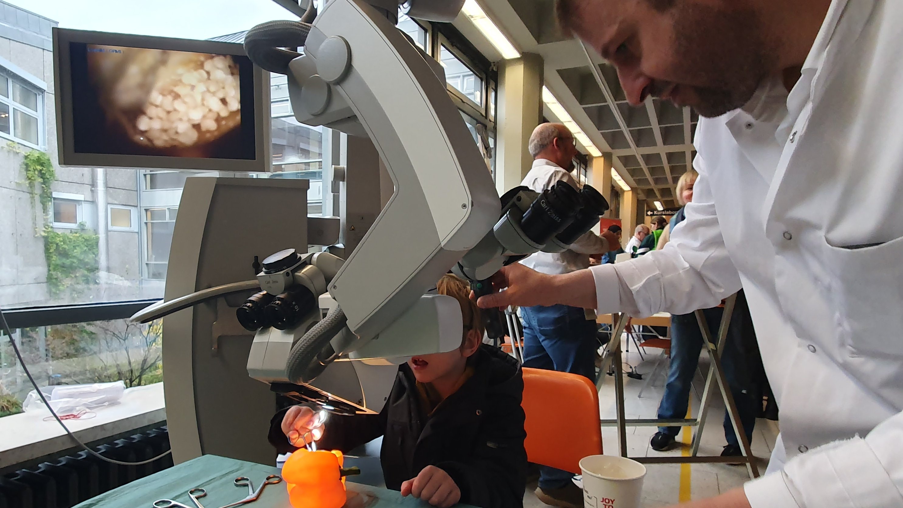 Am zweiten Stand der Klinik für Neurochirurgie hatten Interessierte die Möglichkeit ein neurochirurgisches Operationsmikroskop auszuprobieren und damit in das Innenleben einer Paprika zu schauen. Mittels mikrochirurgischer Instrumente probierten sich sowohl Erwachsene als auch Kinder daran, die Kerne aus der Paprika zu holen. Die Assistenzärzte Herr Filipe Wolff Fernandes und Herr David Jefferson sowie der Oberarzt Herr Dr. med. Philipp Ertl beantworteten Fragen und halfen beim Einstellen des Mikroskops.