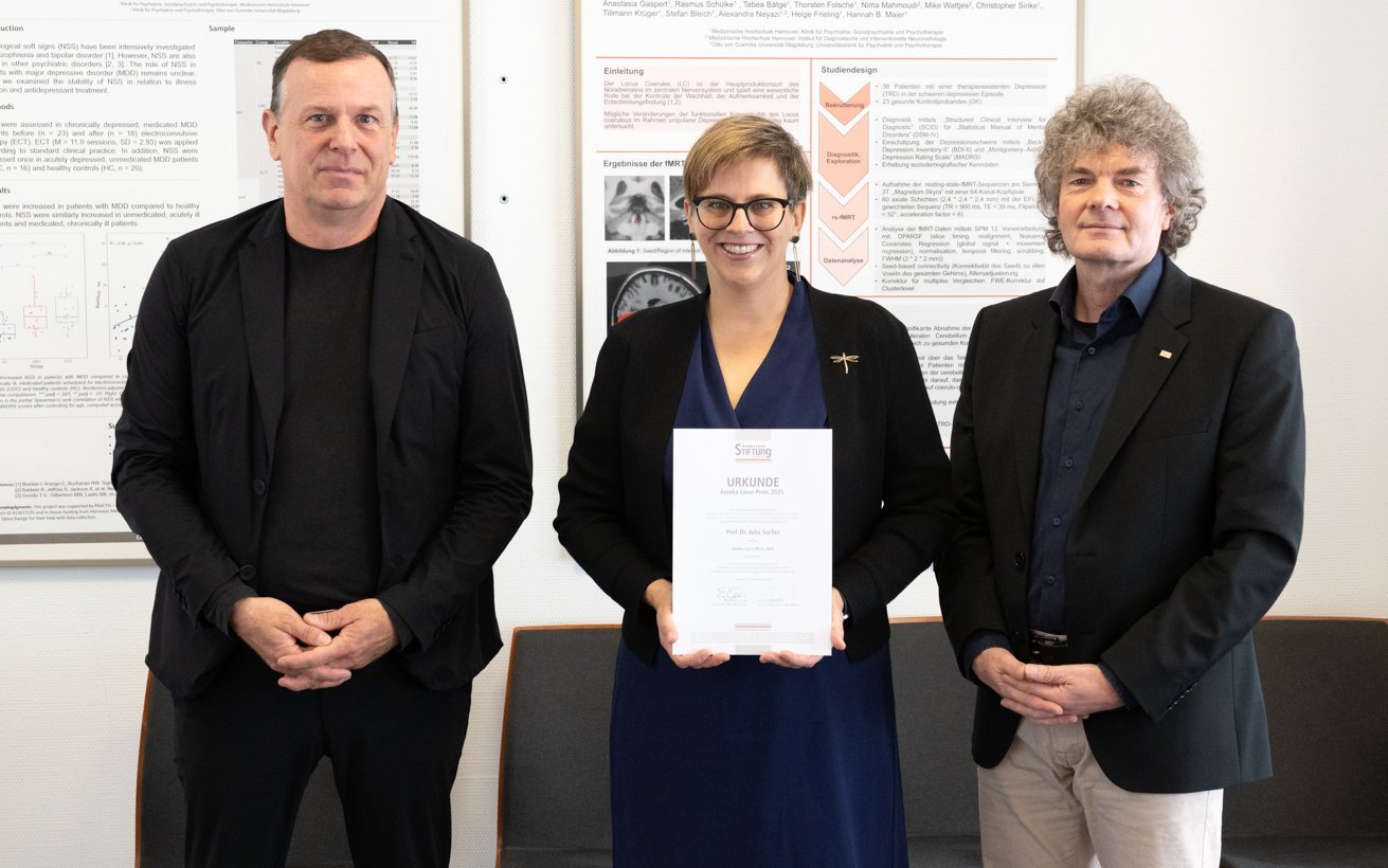 Der Forschungsschwerpunkt von Psychiaterin und Neurowissenschaftlerin Professorin Julia Sacher liegt auf der psychischen Gesundheit von Frauen, insbesondere während hormonellen Übergangsphasen, wie sie im Menstruationszyklus auftreten. Für ihre Forschung auf diesem Gebiet wurde sie nun mit dem Annika Liese-Preis 2025 ausgezeichnet. Professor Sacher konnte in ihrer ausgezeichneten Studie erstmals zeigen, dass sich bestimmte Botenstoffe im weiblichen Gehirn mit PMDD (prämenstruelle dysphorische Störung), einer schwer verlaufenden Form der zyklusabhängigen Depression, kurz vor der Periode deutlich verändern. Genau in dieser Zeit erleben die Betroffenen häufig schwere depressive Symptome. Dieser Nachweis ist ein bedeutender Schritt, denn er liefert einen klaren Hinweis darauf, was in dieser Phase im Körper passiert und warum die Beschwerden so belastend sein können. Für diese wichtige Forschung, die dabei hilft, neue spezifische Behandlungsmethoden zu entwickeln, überreichten Professor Stefan Bleich und Dr. Eckhard Schenke vom Stiftungsrat der Annika Liese-Stiftung Professorin Sacher den mit 10.000 € dotierten Annika Liese-Preis. Die Annika Liese-Stiftung, die treuhänderisch von der Förderstiftung MHH plus verwaltet wird, und der gleichnamige Preis erinnert an Annika Liese, die 1996 durch Suizid verstarb, und ehrt wissenschaftliche Arbeiten, die das Verständnis und die Behandlung psychischer Erkrankungen verbessern.