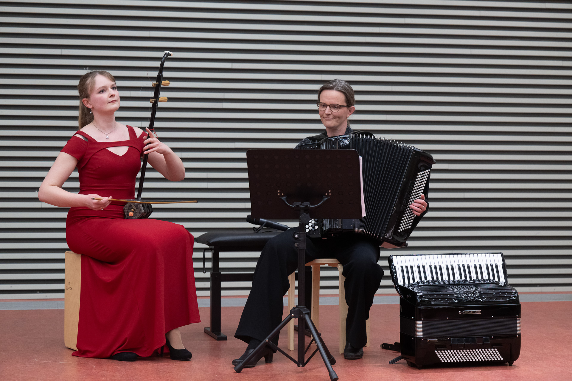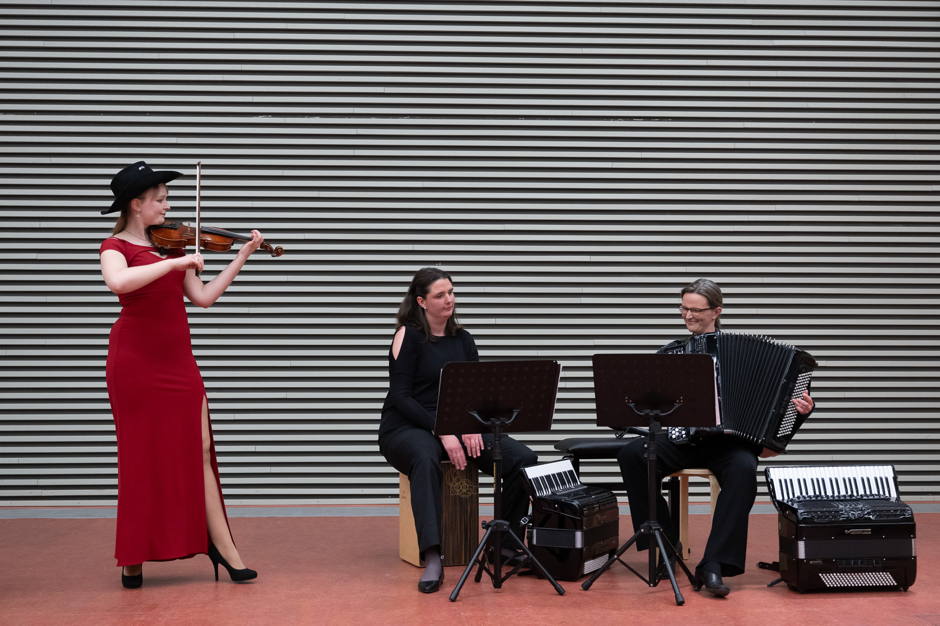 Beim diesjährigen Frühlingskonzert bekam das Akkordeon, Musikinstrument des Jahres 2026, die Gelegenheit zu zeigen, wie wandlungsfähig es ist. Drei Schwestern, die seit mehr als 25 Jahren gemeinsam musizieren, setzten das Akkordeon in Kombination mit einer Violine stilvoll in Szene. Franziska Luisa Hodde-Chriske (Violine) sowie Annemarie Fockel und Stephanie Hodde-Fröhlich (beide Akkordeon) nahmen das Publikum mit auf eine ebenso persönliche wie musikalische Reise. Mit viel Humor und Charme erzählten sie zwischen den Stücken von ihren gemeinsamen Auftritten in Brasilien, China und den USA und griffen diese besonderen Erinnerungen nicht nur erzählerisch, sondern auch musikalisch und mit passenden Requisiten auf. So durfte ein eigens aus Montana mitgebrachter Cowboyhut nicht fehlen, als die Schwestern den Country-Klassiker Cotton Eye Joe anstimmten. Ein weiteres Highlight war Franziskas Präsentation eines besonderen Mitbringsels aus China: einer zweisaitigen chinesischen Geige namens Erhu.