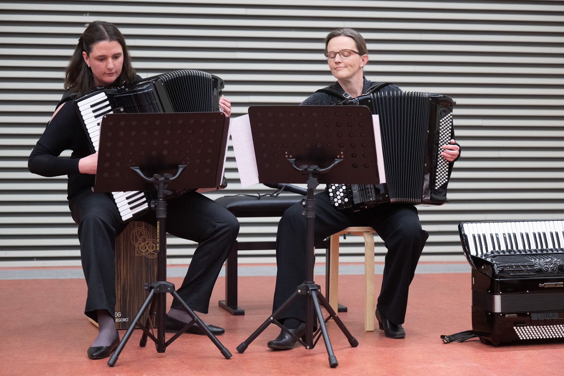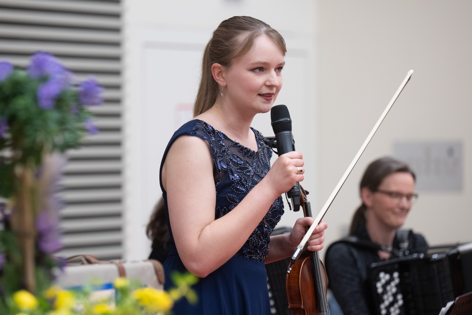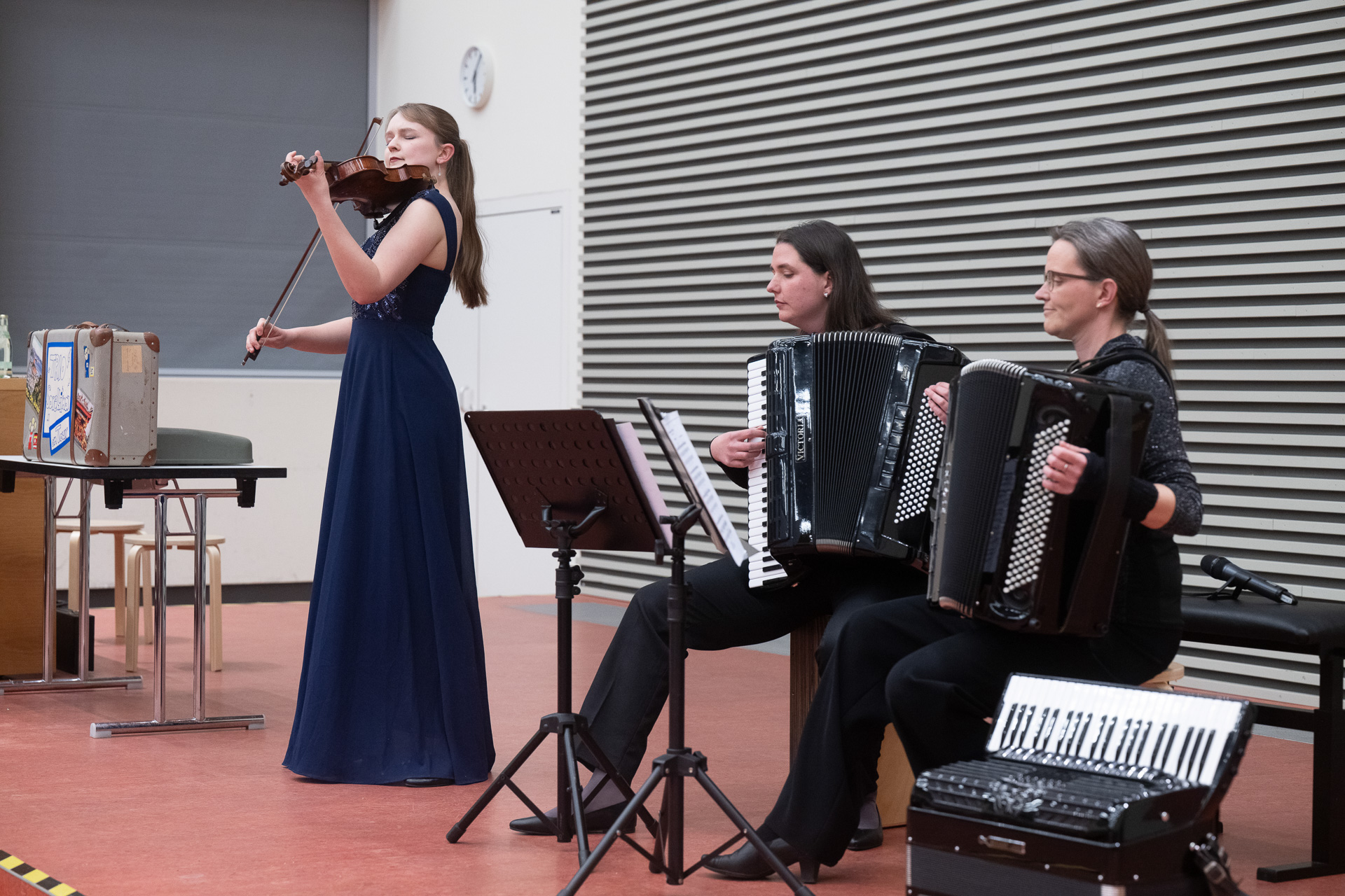 Musikalisch spannte das Trio Sorellina einen weiten Bogen von gefühlvollen Melodien wie Mademoiselle de Paris über feurige Tangos bis hin zu virtuosen Stücken wie Montis Czardas. Im Stil des Komikers Jerry Lewis präsentierte Franziska zudem ihre Fähigkeiten an der Schreibmaschine. Mit solchen originellen Ideen, ungewöhnlichen Instrumenten und humorvollen Einlagen überraschten die Musikerinnen das Publikum immer wieder und machten den Abend gleichermaßen lebendig wie kurzweilig. Mit der Balada para un loco, der Ballade für einen Verrückten, fand ein wundervoller Abend seinen Abschluss. Stephanie Hodde‑Fröhlich brachte die Stimmung auf den Punkt: „Es ist verrückt, wie schnell die Zeit vergeht!“ Ein passender Gedanke zum Abschluss des diesjährigen Frühlingskonzerts, bei dem man kurz den Alltag vergessen und in die Musik des Trio Sorellinas eintauchen konnte.
