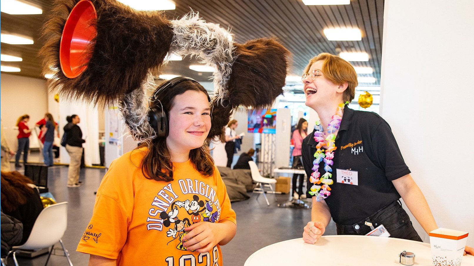 Sehr realitätsnah ging es auch am Stand des Deutschen Roten Kreuzes (DRK) zu. Ein Team der DRK-Notfalldarstellung schminkte den Besucherinnen und Besuchern täuschend echt aussehende Wunden und Verletzungen auf die Haut. Die Handfläche der 21-jährigen Sarah sah aus, als hätte sie in eine Glasscherbe gegriffen, die „Scherbe“ steckte noch in der Hand. „Das machen wir beispielsweise auf Fortbildungen, um Ersthelfern die Angst vor Blut und Wunden zu nehmen“, erklärte ein DRK-Mitarbeiter. Sarah jedenfalls fand ihre „Verletzung“ sehr beeindruckend. Sie besuchte die Campus-Tour gemeinsam mit ihrer Freundin Milena (20), um sich einen Überblick über die Ausbildungen und die Möglichkeiten eines Freiwilligen Wissenschaftlichen Jahres (FWJ) zu verschaffen. Dabei kam es ihnen vor allem auf die unmittelbaren Auskünfte an. “Sich persönlich mit den Leuten zu unterhalten bringt einfach mehr, als sich die Informationen im Internet zusammenzusuchen“, ist Milena überzeugt. Über das FWJ informierte sich auch Lea (13), die von ihrer Großmutter begleitet wurde. Beide waren erstaunt, in wie vielen Bereichen so ein Freiwilliges Jahr absolviert werden kann. Ein Beispiel dafür ist die Physikdidaktik, in der es unter anderem auch um die Wahrnehmung von Geräuschen geht. Für ein Experiment setze sich Lea „Monsterohren“ auf, die aussahen wie ein zotteliges Hirschgeweih.