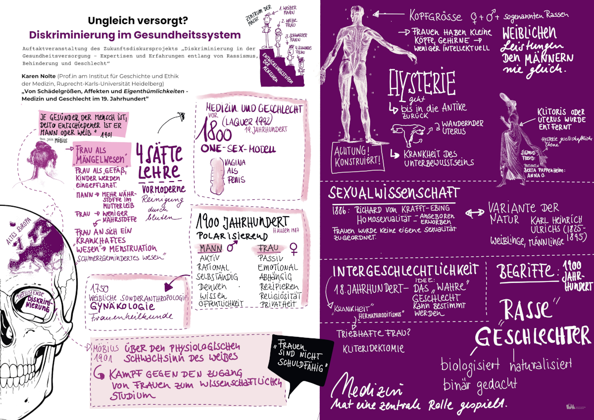 - Karen Nolte (Prof.in Institut für Geschichte und Ethik der Medizin, Ruprecht-Karls-Universität Heidelberg) beleuchtet in ihrem Vortrag, wie sich im 19. Jahrhundert gesellschaftliche Vorstellungen von Geschlecht wandelten und wie die Medizin zur Biologisierung geschlechtsspezifischer Zuschreibungen beitrug.