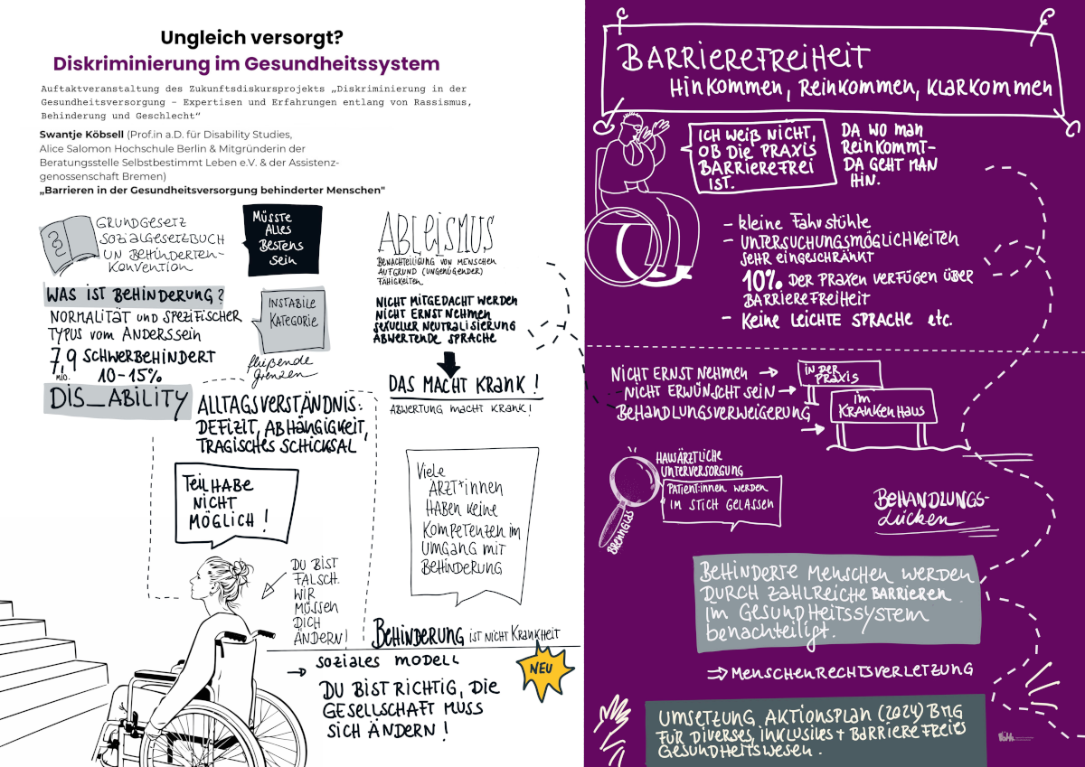 - Swantje Köbsell (Prof.in a.D. Alice Salomon Hochschule Berlin, Beratungsstelle Selbstbestimmt Leben e.V.) thematisiert physische und mentale Barrieren in der Gesundheitsversorgung behinderter Menschen sowie behindertenfeindliche Strukturen in der Gesellschaft.